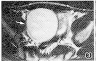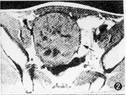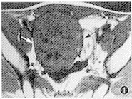 圖1 MRI橫斷面SE T1WI,盆腔內(nèi)見一橢圓形軟 組織信號腫物(↑),約9cm×7cm×8cm大小,邊緣光滑,信號不均勻,包膜呈低信號 圖2 與圖1同一位置的T2WI,腫物(↑)呈長T2高信號, 其低信號包膜顯示更清晰 圖3 與圖1,2同一位置,經(jīng)靜脈給予釓噴酸葡甲胺(Gd-DTPA)后橫斷面T1 WI,腫物呈不均勻中度強(qiáng)化,其內(nèi)見低信號無強(qiáng) 化壞死區(qū)(↑)